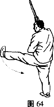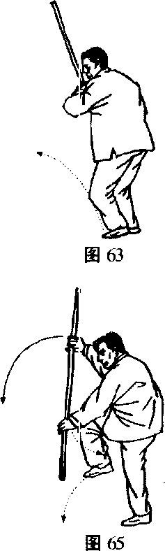 左转腰,以右足跟为轴,足尖里扣,身向西转,左足下落至 右足前成蹲步,同时右手持棍向右下落,左手棍向右上抬,双手 竖棍于右侧,接着提起左膝,以足跟向西蹬出。(图63、64)