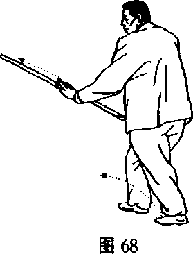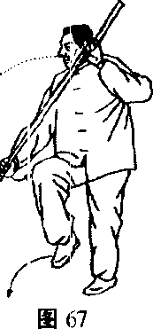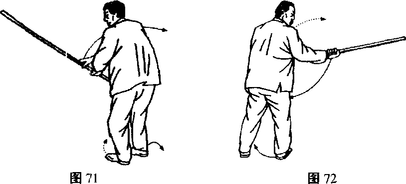 含胸拔背,重心略后移,右足外撇,左手持棍略前滑,右手 则持棍上扬,抬起左尺向西南迈出,目!J弓成左弓步,问时右手持 棍握满把向西北方向下压,左手棍则上提成斜坡状,意念上领, 目视棍端。彳:图69、70)