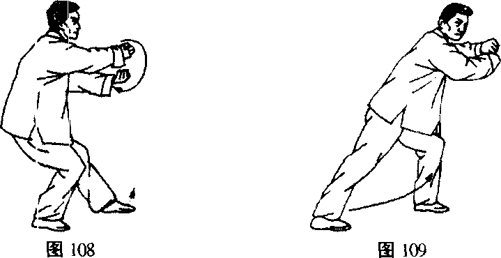 1.披身旁进:含胸,身后坐,重心移于右腿,右足尖翘起 成左太极势。接着左足向左前方外移尺许,再前弓成左弓势桩 型。同时右拳变俯掌,左立掌变仰掌伸向右腕下如抱球。随后两 掌脉窝相在胸前顺转走“金龙锁口”后变拳,向上、向左拉 到左耳旁。眼看东南方向。(图108、109)