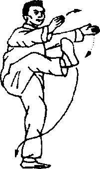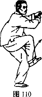 2.钩脚前蹬:重心移于左腿,含胸、沉裆,站稳。提右膝 高与胸平,足掌里钩,向东南方向蹬出,高与裆平。同时双拳向 上、向外翻,分向左右下劈均成侧掌,如抱大树。眼看右手。 (图 110、111)