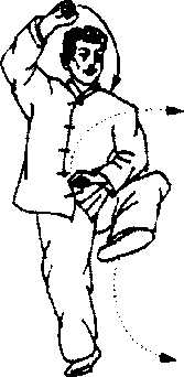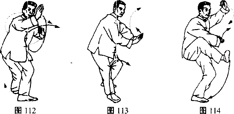 打虎亮相:迭左胯、再松胯,调整脚形(左足里扣或外撇) 使身向东复又迭跨重心仍在左足。提起右足,脚掌翘起,亮出脚 底成接腿状,置于左膝右上方,成左圆裆独立势。同时左掌向北 偏东随滚小臂向上顺转半个圆圈,置于左额角上方,成侧拳拳心 斜向外;右掌变俯拳横在胸前,肘尖与右膝相对。左拳在上,右 拳居中,右足在下,二者几成垂直,支重的左腿屈膝与地面约成 25度角。身与视线均向东。(图114)