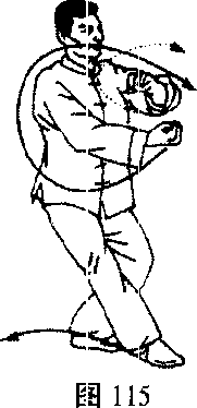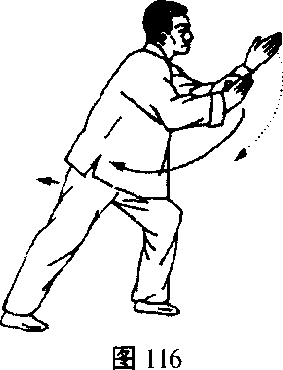 弓膝引掌:右足徐下落,置于左足前,小趾点地,成圆裆右 高架虚势。同时两拳下落于胸前,两臂棚开,右拳变仰拳在下, 左拳变俯拳在上成合抱状。(图115)接着双拳变掌以肘为轴向 下、向后从西南方上升再向东北方下落逆转一圈变侧掌呈纵圆 形,左掌在前在上,右掌在后在下作“双引掌”,同时右足经左 小腿内侧后退一步至西南方成左弓势。眼看东北。(图116)身 向后坐,右掌捋到胸右侧变仰掌,左掌向下横按到右掌之下成俯 掌,双臂棚开呈右高左低的坡圆形。眼向东看。(图117)