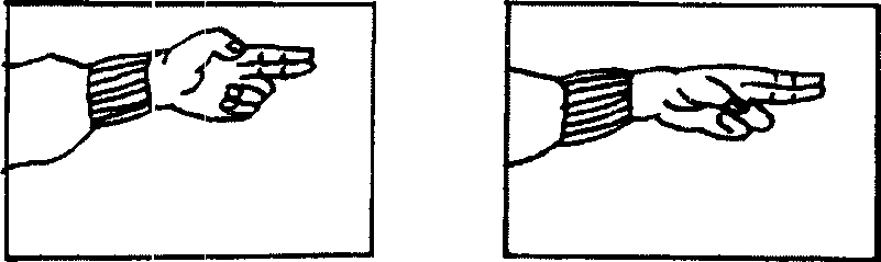 左手的形状有三:一是全掌,五指前伸,其中主要是食指、 中指、无名指三者推腕助力或左掌上托右手背。二是散指,是运 剑过程中,由全掌到戟指中的过渡形状,此时食指中指伸直并 紧,大指与无名指、小指向掌心回屈。三是戟指,在剑势定式时 使用,此时食指与中指伸直并紧,拇指压住无名指和小指首节 上。(图5)