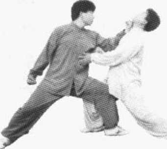 图 4.151图 4.151图 4.152图 4.152图 4.153图 4.153动作三,接上势,我若右拳不击彼,即可逆缠 向上托掌直击敌下颌,同时右膝提起上撞彼裆部 (图 4.152)。