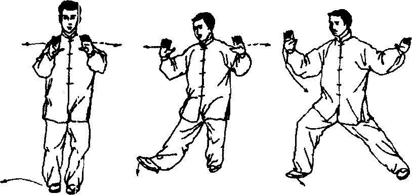 迈步分掌成弓步单鞭势,动作要连贯,一气呵成。定势 时,要沉肩垂肘,效臂沉胯,上体中正,肘膝相照,右拿不得 超过右脚尖。