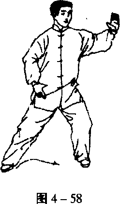 L上体左转,重心移向左腿并屈蹲,右脚以脚跟为轴内 扣;右掌向下、向左弧形落于右胯前;左掌稍向上举;眼看左 掌(图 4-58)。
