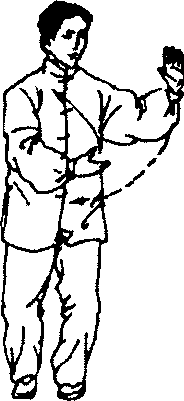 5 .右脚以脚跟为轴内扣,重心仍在右腿并屈蹲,上体左 转;随之,左脚收至右脚内侧,脚跟着地,脚尖稍上翘,左腿 屈膝;同时左掌继续向上经额前向左划弧内旋云掌,掌心翻向