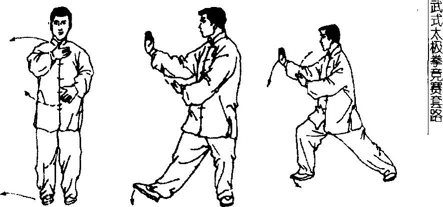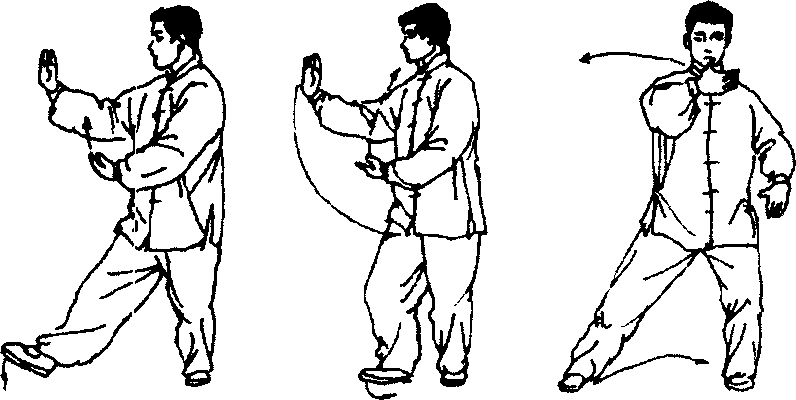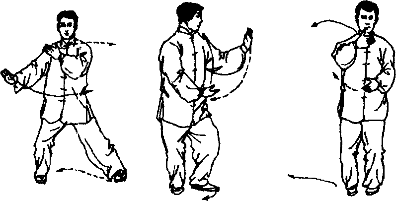 两手在体前交叉划立圆,要与收脚迈步左右转体协同一 致;动作要求连贯圆活,在连续左顾右盼的步法运行过程中, 身体不要有起伏现象;转体收脚或转体迈步时,上体均保持正 直,敛臀坐胯,虚领顶劲。向左转体云手,右腿支撑重心,右 脚以脚跟为轴内扣,这是武式太极拳不移重心而转脚换势的特 点。