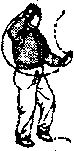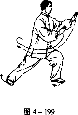 1 .右脚屈膝向右后落步,全脚掌落平;重心偏于左腿, 左腿前弓;两掌向左前自然下落,掌心均斜朝下;眼看两手方 向(图 4-199)。