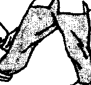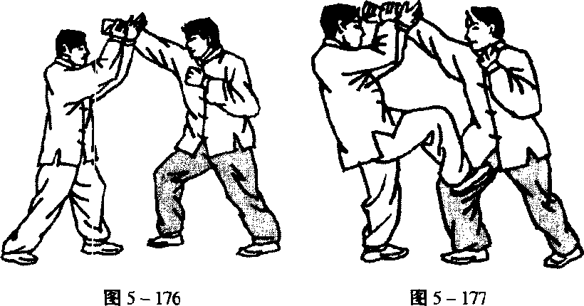 甲用顺步右冲拳进攻乙头部,乙用双手向上十字架封来 拳;同时用右腿弹踢甲裆部,或用脚踩击甲膝关节,甲因疼痛 必后退(图5-176~ 178)。