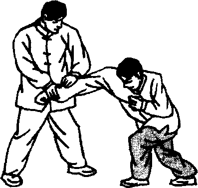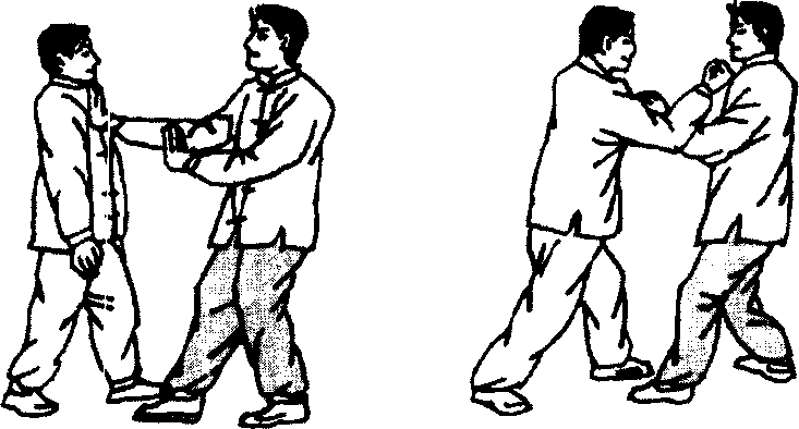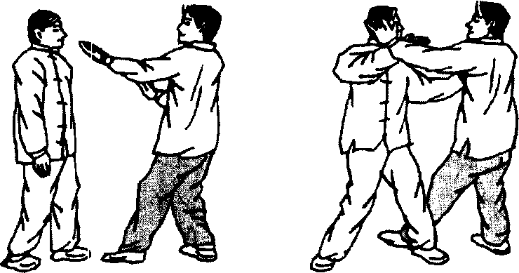 甲上左步出左掌穿击乙咽喉,乙左脚迅速抢上一步别住甲 左腿;同时右手抓掳住甲左手腕部下按,左手以食、中指插击 甲咽喉,甲因而受制于乙(图5- 179、5-180)。