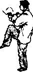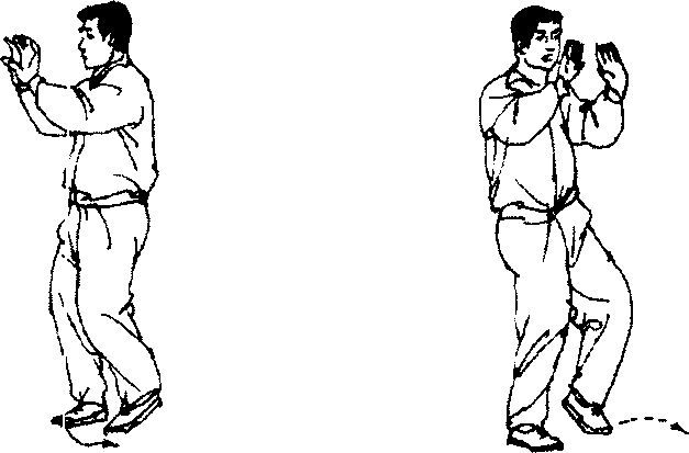 1 .重心仍在左腿,右脚向前迈步,脚尖上翘,脚跟着地, 两腿仍为左实右虚;两手不动;目前视(图6-40)。
