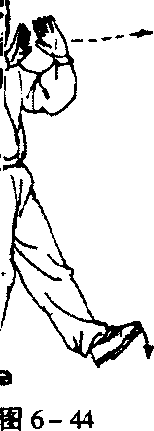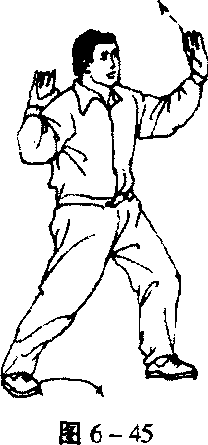 2 .重心仍保持在右腿,左脚向前迈步,脚尖上翘,脚跟 着地;两手不动;目视不变(图6 - 44)。
