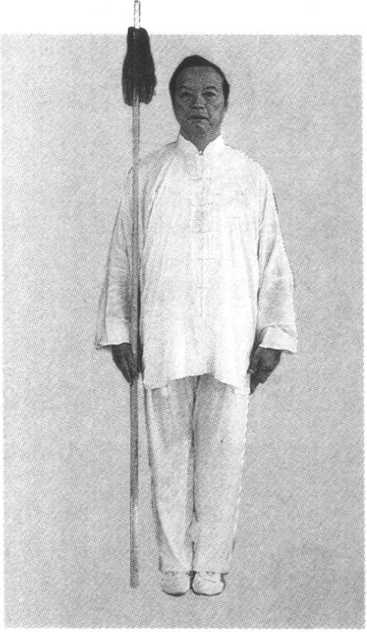 身体直立,左脚内收,两脚并拢;同时右手向上滑握枪中 段处,持枪使枪直立于身体右侧,把端触地;右手脱枪,臂垂于 体侧,左掌指尖轻贴大腿侧。眼视前方。还原成“预备势”(图5- 45)O