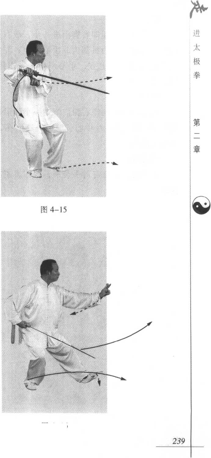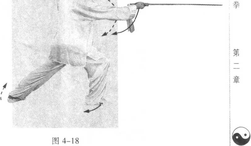 身体继续左转,左脚向左前方迈出,脚跟着地,重心落于 右腿;右手持剑向下、向右划弧于右腰旁,掌心向上,平剑剑尖 向前;同时左剑指向下经体前向左前方伸出,指尖略同肩高。 眼随剑指方向(图4-16)。