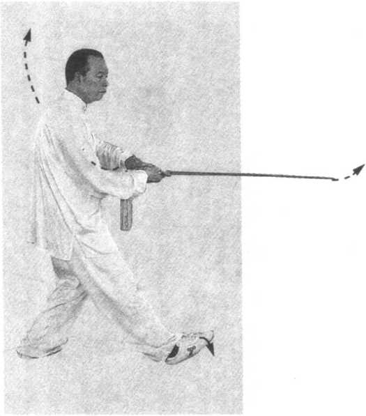 左脚迈步时须经右腿内侧划一小弧形再向前落步。扣腕 收剑时可略含胸,弓步前刺时则可略展胸,与转腰、胸腹的虚 实变化协调一致。
