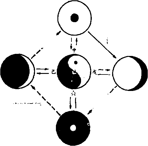 凡物,小到无可小的分子时,也必有一个中心存在,此中心也同样 具有阴阳两个属性。事物的一切变化所表现的形式都是分动、静、 合,赖以主宰,而成总体之象。