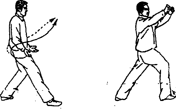 3. 右脚向东南方向落一步,身体重心移至右腿上。右腿屈膝 半蹲;腿自然伸直,成右弓步。与此同时,两手半握拳分别从两侧 向上、向前划弧贯拳,两拳的拳眼斜朝下,高与耳平。目视贯拳方 向(图 4-128.4-129)o