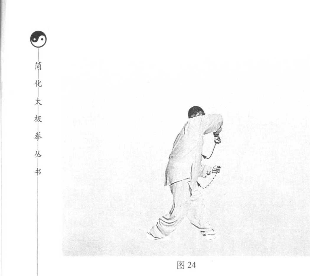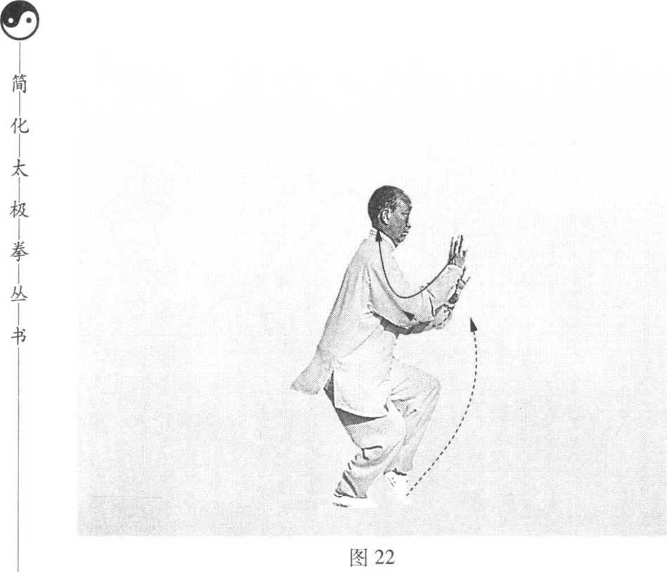 重心移向右腿,右脚尖微内扣;左脚收回至 右脚前,脚尖点地。同时,右手外旋,向后、向 上经头顶划弧落到右胸前,手心向东北方向;左 手外旋,划弧收回左腹前,手心向东。身体左转 向东Q眼向东平视(图22)。