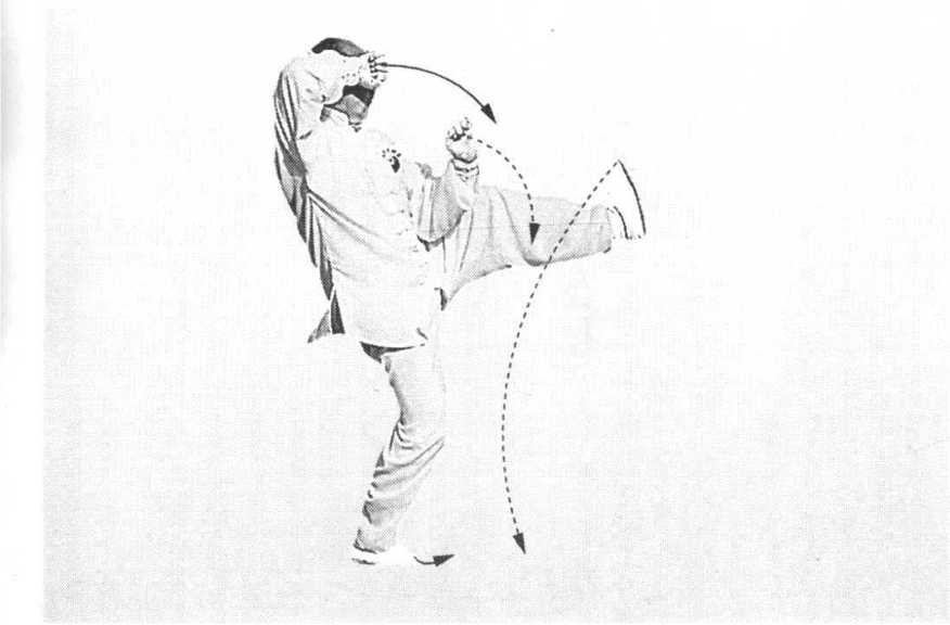 右脚抓地;左腿上提,高于胯,脚心朝东。 同时,双手由掌变拳,双拳成环形,由前向下、 向后再向左划弧,右拳与额同高,拳眼向下,拳 心朝外;左拳置于胸前,拳心向南,拳眼向西。 眼向东平视(图23)。