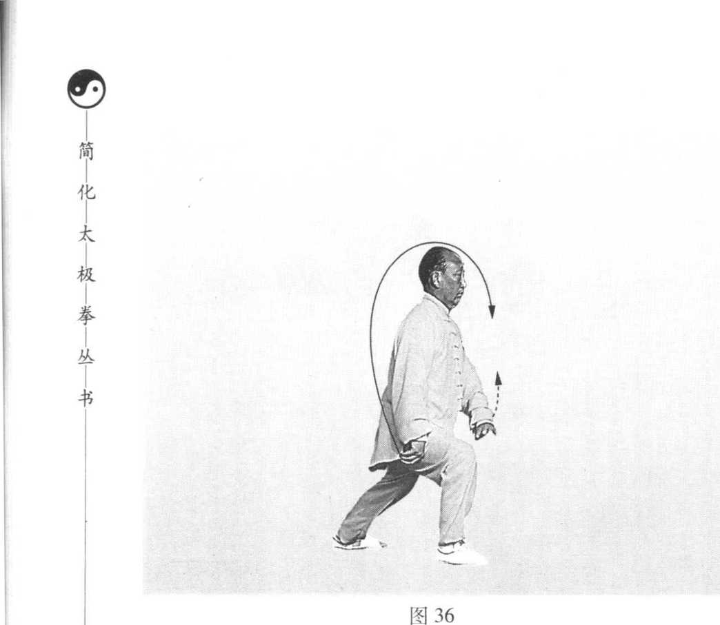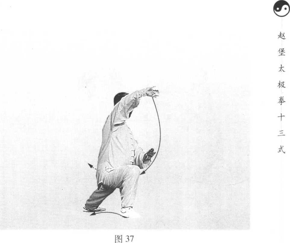 动作五:左脚向西北方向退一步,成右弓左蹬步^ 同时,右掌变勾,绕膝关节搂至右腿外侧,勾 尖向后;左手由下向后、向上经头顶、脸前划 弧至小腹前,手心向下,指尖朝东南。眼向东 平视(图36 )。第八式搂膝斜行第八式搂膝斜行动作一:第八式搂膝斜行第八式搂膝斜行右勾手变掌,由右腿外侧向后、向上划弧至 头前;左手弧形上提至胸腹前(图37 )。图38 附图38图38 附图38动作二:图38 附图38图38 附图38