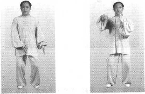 重心落于左脚;双手带臂逆时针向左下方划弧,左手落于左腿外侧,右 手落于裆前,掌心相对,距一前臂远,指尖向下;同时,身体屈膝下坐,右腿变 虚,头部和其他部分要求不变(图23 )。