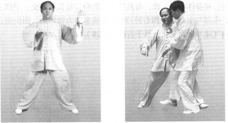 (2) 图25 图26图25 图26太极拳道真太极拳道真歌诀:霸王气雄力顶天,争夺天下舞单鞭。 千里良驹知人意,白马过隙一瞬间。歌诀:霸王气雄力顶天,争夺天下舞单鞭。 千里良驹知人意,白马过隙一瞬间。对方推我左肘时,我向右化劲的同时,左脚插入对方左脚后,然 后向左挤按发劲,使对方向后失去重心(图26)。