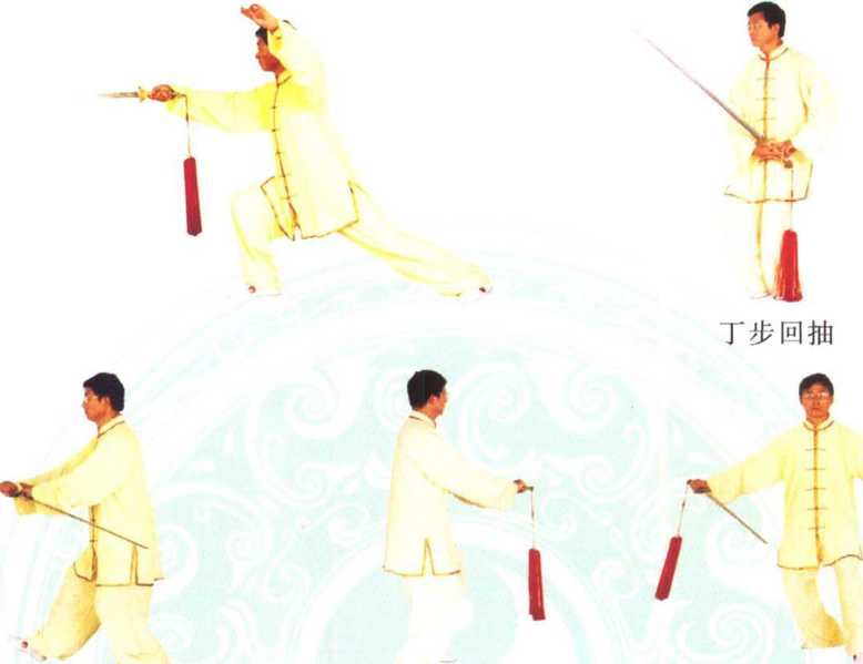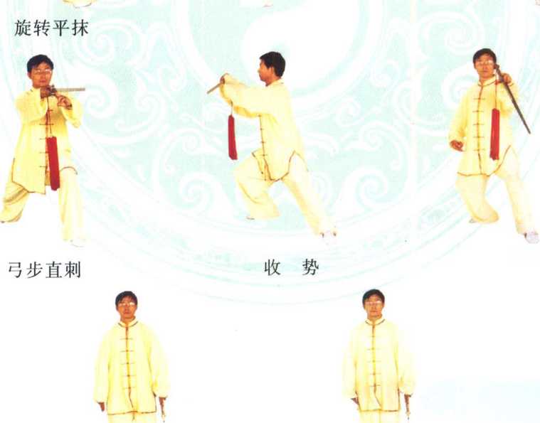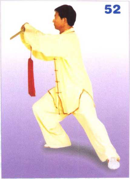 接上式,身体向右转,重心移 于右腿,右腿屈弓;右手持剑,右 臂屈肘立剑向右后收于体前,掌心 向内,剑尖向左,左手剑指变掌, 同时屈肘回收附于剑把,掌心向外, 剑指向右,准备接剑;眼随体转向 前平视。(图52)