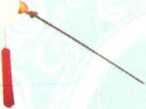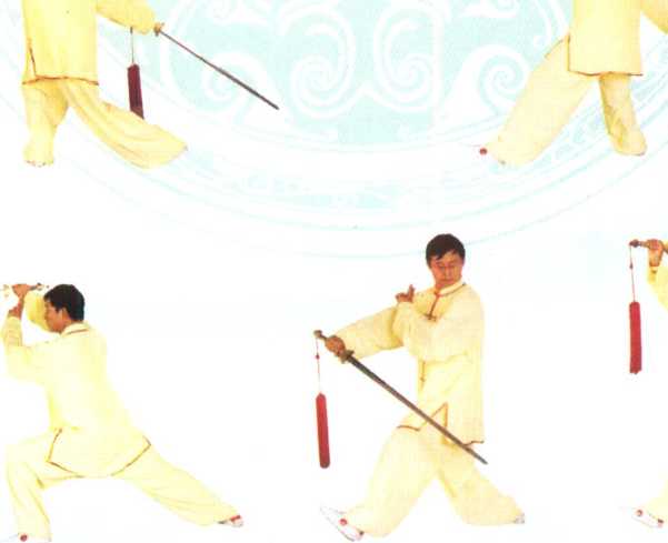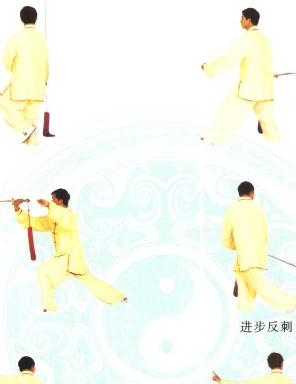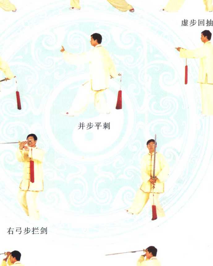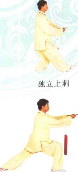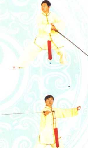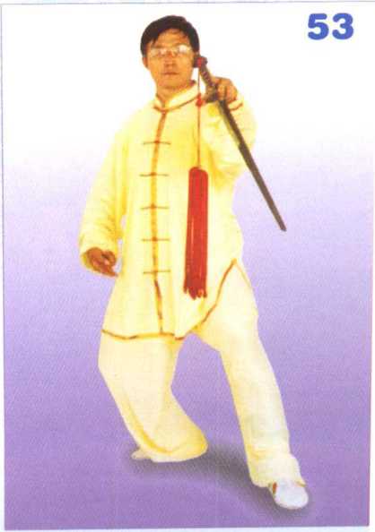 接上式,重心于右腿;左脚提起向 前迈出,脚跟先落地,重心移于左腿, 左脚全脚落地踏实,左腿屈膝慢慢向 前弓出,成左弓步;右手持剑立刃前 刺,腕与胸平,掌心向左,剑尖向前;左 手剑指附于右手腕部,掌心向下,剑指 向上;眼视剑尖方向。(图51)