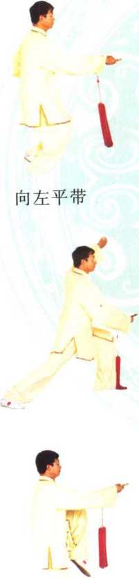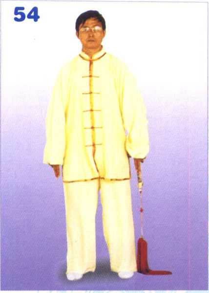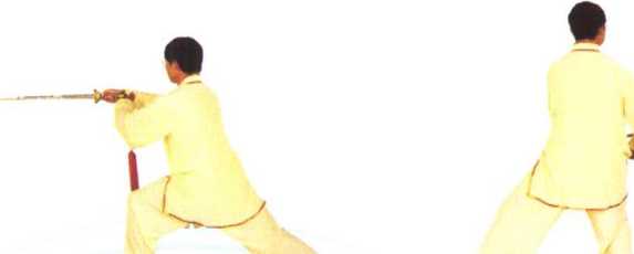 身体左转,重心移于左腿,右 脚提起向左脚内侧靠拢成开立步; 左手握剑,掌心向外向上经体前落 于身体左侧,掌心向后,剑尖向上; 右手握剑指,向下向后再向前下落 于体右侧,掌心向后,剑指向下; 眼向前平视。(图53、54)