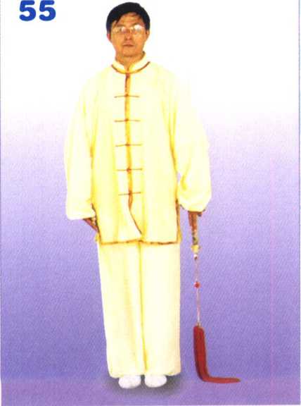 重心于右腿,左脚跟先离地, 随即左脚轻提收至右脚侧,前脚掌 先落地,随重心稍左移,全脚掌落 地踏实,双脚尖向前成并立步;右 手剑指变掌轻贴于右腿外侧,掌心 向内,掌指向下;左手持剑掌心向 后,剑尖向上,剑身紧贴左前臂下 侧。眼向前平视。(图55) [动作要领】①身体自然直立「头颈 正直,下须微内收。②两肩松沉, 剑身平贴于左臂后侧。