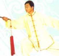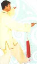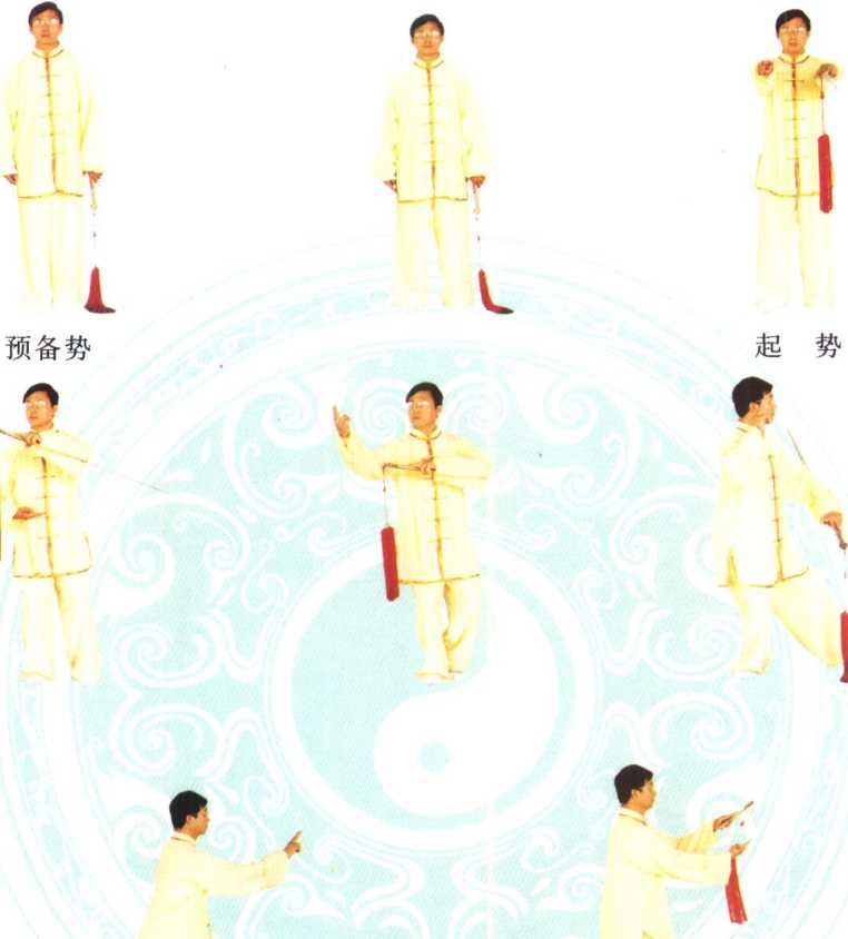 【动作要领】①身体中正,双臂松 垂。②两臂自然弯曲,剑身紧贴左 前臂下侧。