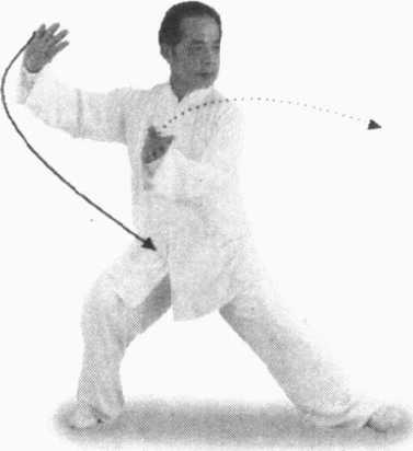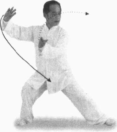 要 领:此为插步转身三百六十度云手,分三段写出,实为 一连贯的动作,不可有间断的地方,充分体现出以腰为轴,节节 贯穿的园活风格,同时也要注意重心的虚实变化及胸中、腰间的 意气转换。