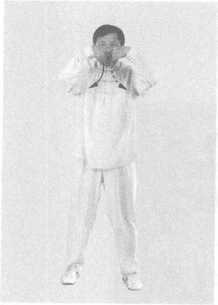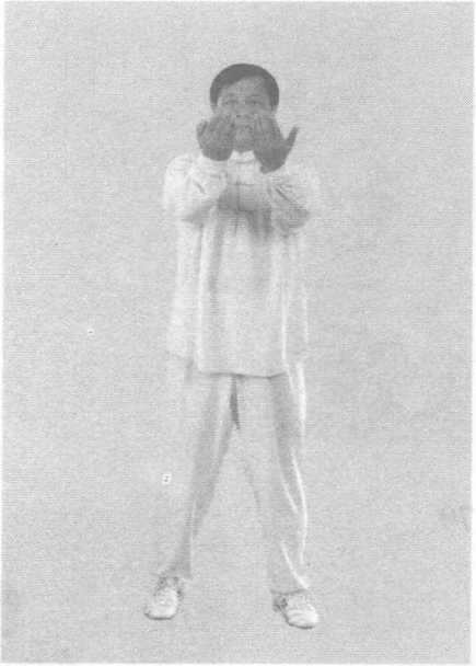 手心朝下。同时,身体朝 前,右脚向正前方上一步,脚尖轻轻点地。然后重心前移,左 脚向正前方上半步,脚尖点地,两腿并步屈膝。同时,两手向 前下划弧。(图175一图177)图178⑤ 左脚向左侧迈步,两腿伸直,与肩同宽。同时,两手向 前、向上划弧捧起,手心朝上,与肩同高。(图178),?: :i::图180图180图179图180图180