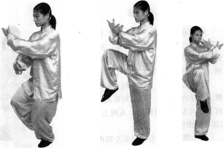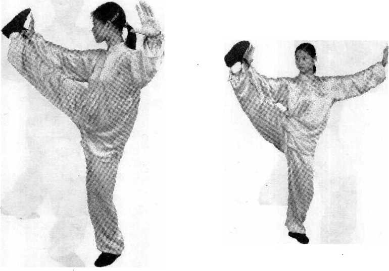 ④ 左腿微屈站稳,右腿屈膝提起,右脚向右前方(约30度) 慢慢蹬出,脚尖上勾,脚跟高过腰部,两掌分别向右前方和左 方划弧分开,掌心向外,腕与肩平,两臂伸展,肘微屈,右臂 与右腿上下相对,目视右掌。(图108~图109)