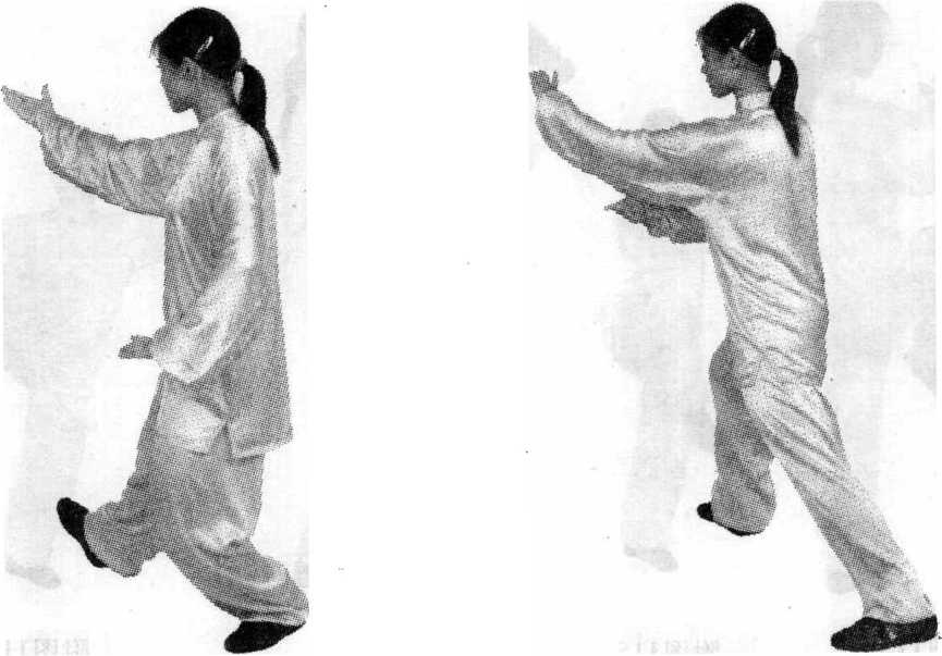 ⑤ 右腿屈收,右脚向右前方落下, 脚跟着地;右前臂外旋,右掌心转向 上,稍向内收,左掌下落,经腰间向 前、向上划弧伸至右肘内侧,掌心向 下,目视右掌。(图110-图111)