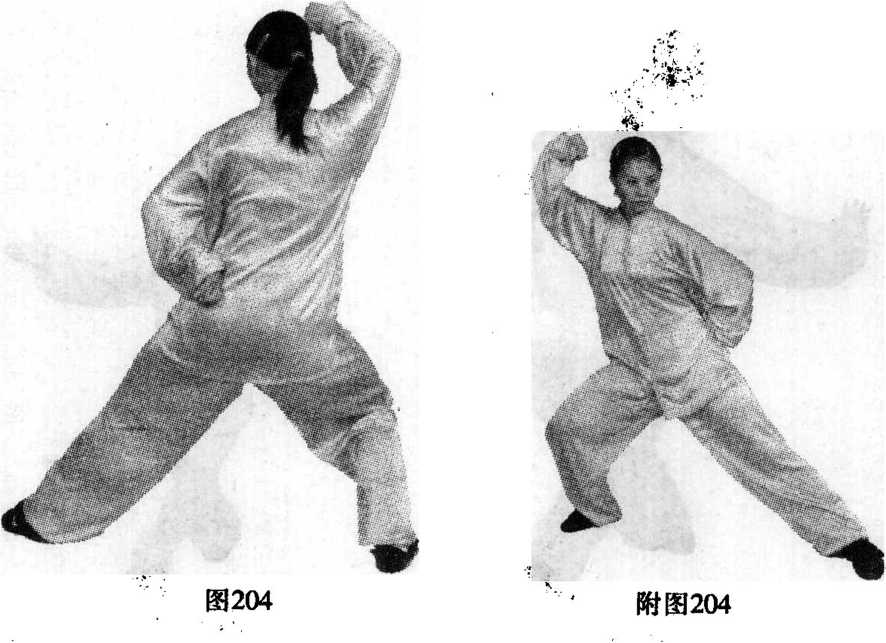 ① 上体右转,重心右移;右臂内旋屈肘上撑,右拳置于右 额前,拳心向外,左臂内旋,左拳向身体左后方穿出*拳心向 后「目视前方。(图204)