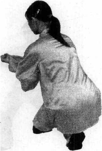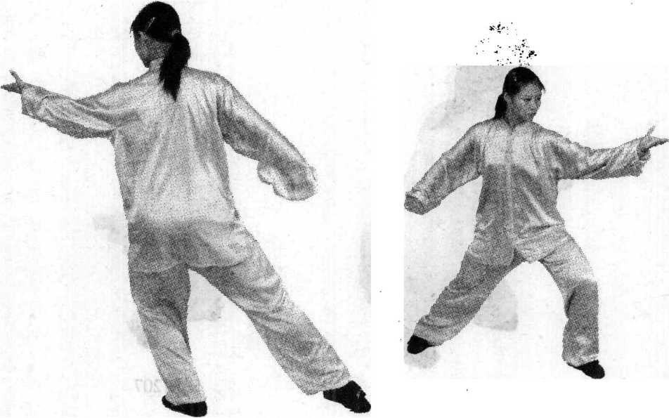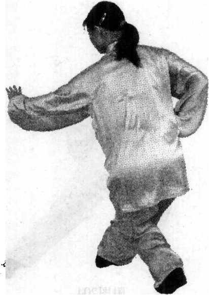 ⑥ 整个动作要做到虚实清楚,转换轻灵,要随腰的转动来 带动手臂。盖步时臀部不要突出,应向里收进,腰部不收敛, 不正直,臀部就容易突出。