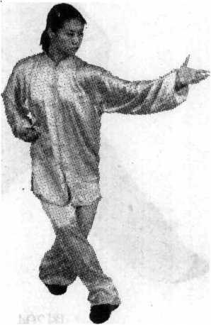 ② 转体、重心前移与收拳、伸掌应协调一致,同步到位。 在右掌下落变拳同时,左掌先外旋,向前向上伸挑翻转后,左 肘与左膝相对.注意敛臀。