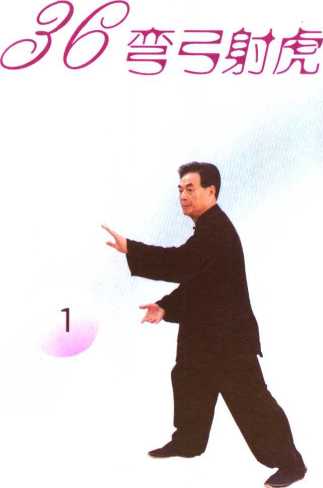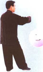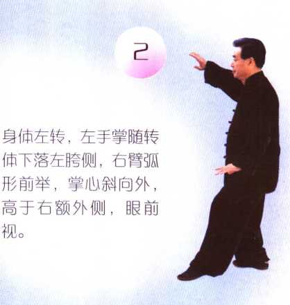 身伟继续右转,重心渐 移左腿。同时左臂屈肘 右转,右臂弧形向右排 圈,眼随手转。