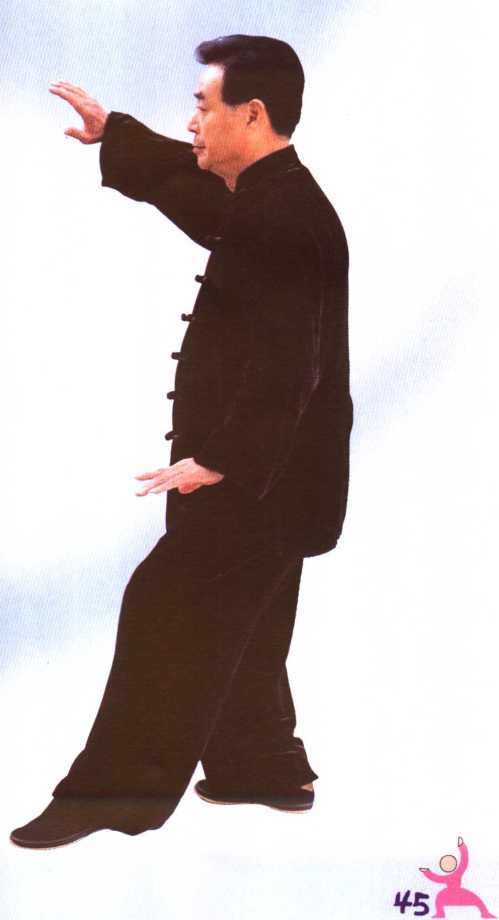右脚后退一步,重心移于右 服,左脚移于右脚左侧前,脚 掌点地成左虚步。身伟微右 转,左拳变掌下落腹前,右拳 变掌弧形向右上方分开,掌 心向外,眼畸手转。
