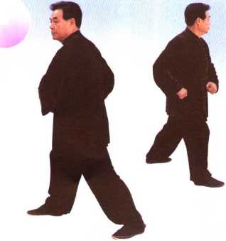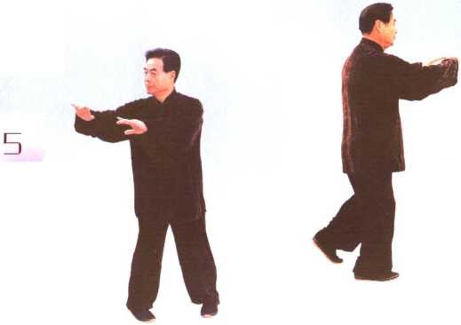 左腿提起,向右后弧形旋转,上 步,同时两臂畸佛转至右胸前, 掌心向下,眼视两手间。