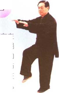 身伸重心移向左 腿踏实,右腿屈 膝提起,脚尖向 外,身伸继续右 转,两臂屈肘在 胸前,眼视两掌。