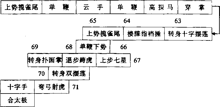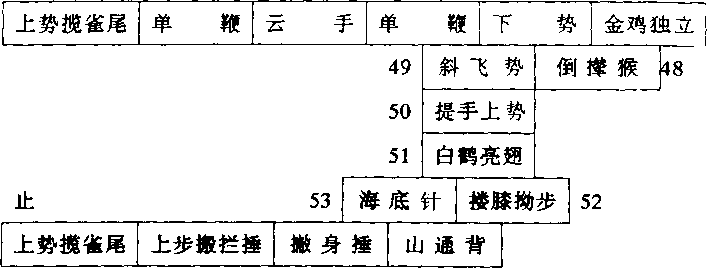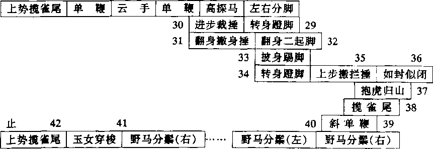 杨式太极拳小架路线图:起1 太 ]2 |揽雀尾 单鞭「| 3提手上势5白鹤亮翅搂膝拗步手挥琵琶进步搬拦捶如封似闭抱虎归山 揽雀尾11斜单鞭|1215斜飞势倒撵猴|肘底看捶16提手上势 14 1321 20 19 17 白鹤亮翅|撤身捶]山通背海底针搂膝拗步上势揽雀尾退步搬拦捶2222232222起 23 24 25 26 27 28杨式太极拳小架路线图:起42434445464757565554