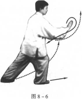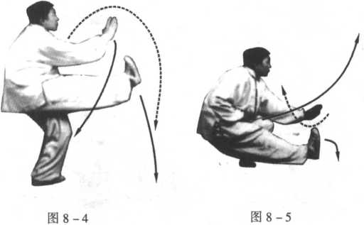 束身向前下落,变为脚跟点地,脚 尖向上,右腿伸直;左腿同时屈膝 下蹲,成为右龙形步;同时,两八字 掌随上体右转和两臂内旋,以右先 左后,顺立圆经胸腹翻滚内裹上 起,变为柳叶掌向前劈落,右掌收 回至洞中,变为掌心向左,掌指向 前,右臂屈肘靠右肋;左掌变为掌 心向右,掌指向前上方,高于右脚 尖,左臂伸直(图8-4、图8-5)。