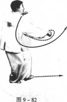 成为右单重步;同时,两拳随上体右转,右拳顺弧翻转上起至上 体右侧变为掌,掌心向左,掌指向前,与肩相平,右臂屈肘;左拳 拧转打出至体前成棱捶,高与心窝相平;头微抬(图9 - 82)。