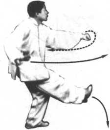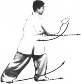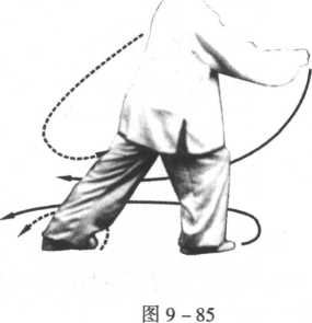 (1)接上式,右后脚倒撤一步落地做主,左脚跟回至右脚前,