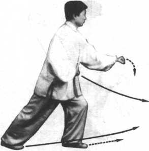 2 .动作不停,右脚向前迈进一步落地,左脚后蹬,左腿绷直 展身,成为右虎步;同时,随上体左转展身和左臂内旋,右臂屈肘