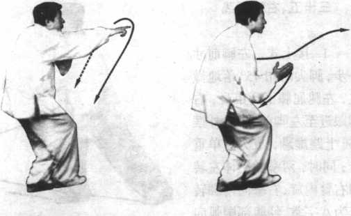 图 9-361臂外旋左裹下落至体前,变为掌心向上,掌指向前上方,与右肩 相平,右臂屈肘,右肘靠在心窝处;左拳变为掌,掌心向右护在右 肘内侧,左臂屈肘靠左肋;头 微抬,两眼平视前方(图9- 361、图 9-362、图 9-363)。