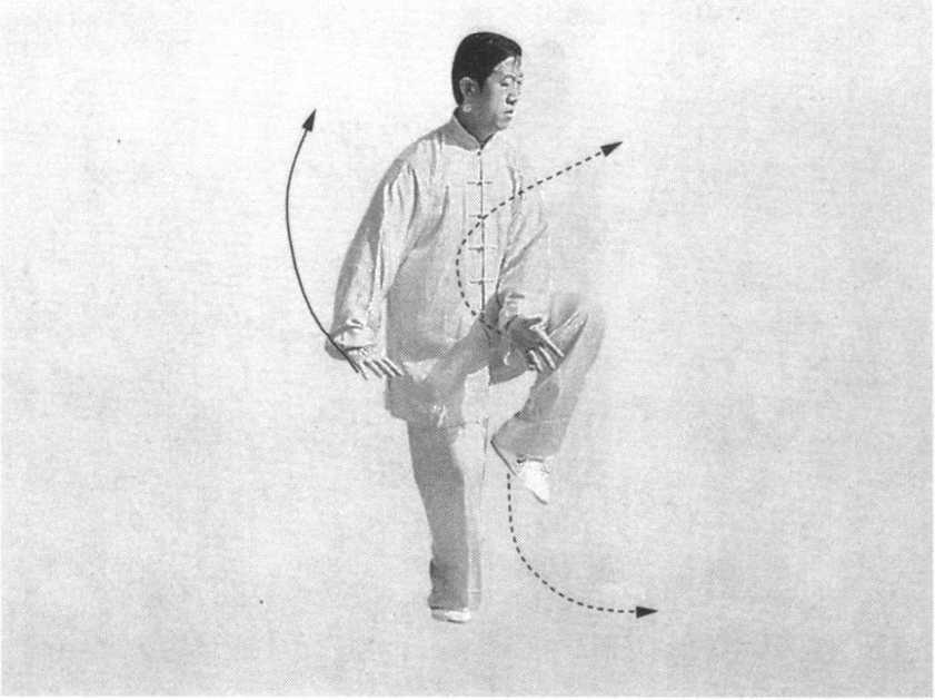 动作一:身体下沉。同时,双手顺缠向下合于左膝上 (图 39)。图40动作二:双手领劲上糊,左手在前,右手在后,立掌 于胸前。同时,重心移至右脚,左脚收至右脚左 前方,脚尖点地。目视前方(图40)。图41
